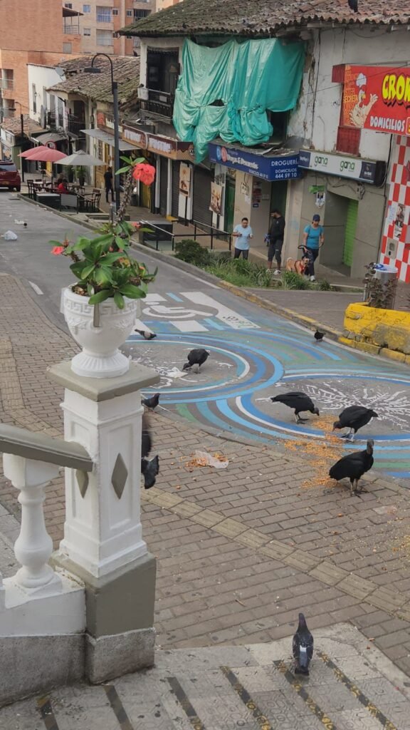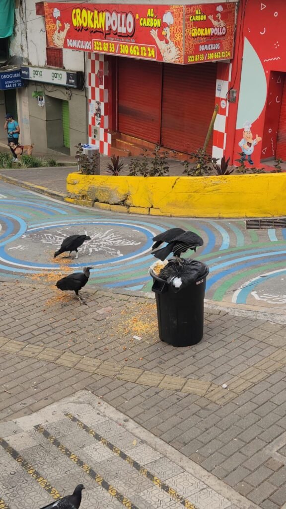 La falta de recolección oportuna ha desatado la llegada de gallinazos, perros de la calle y habitantes en condición de calle, quienes desgarran las bolsas buscando alimentos. Las escenas muestran a estas aves carroñeras disputándose sobras, esparciendo los residuos por la vía pública.